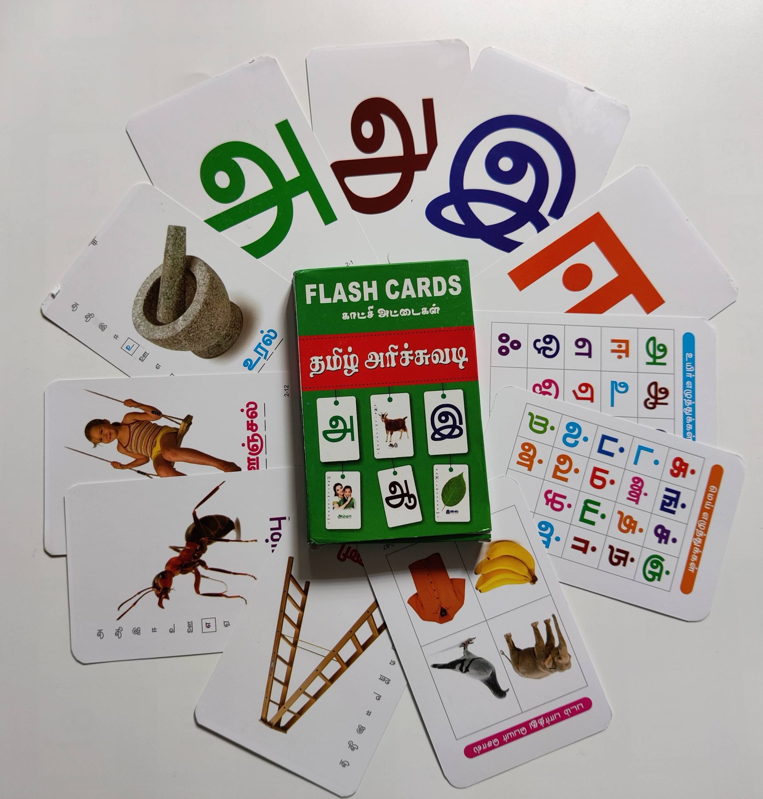 These Tamil Alphabet Flash Cards are specially designed to help children learn Tamil letters (Uyir & Mei) in a simple, interactive, and engaging way. Each card features bold Tamil letters with clear pictures, helping kids easily recognize letters, sounds, and related objects.