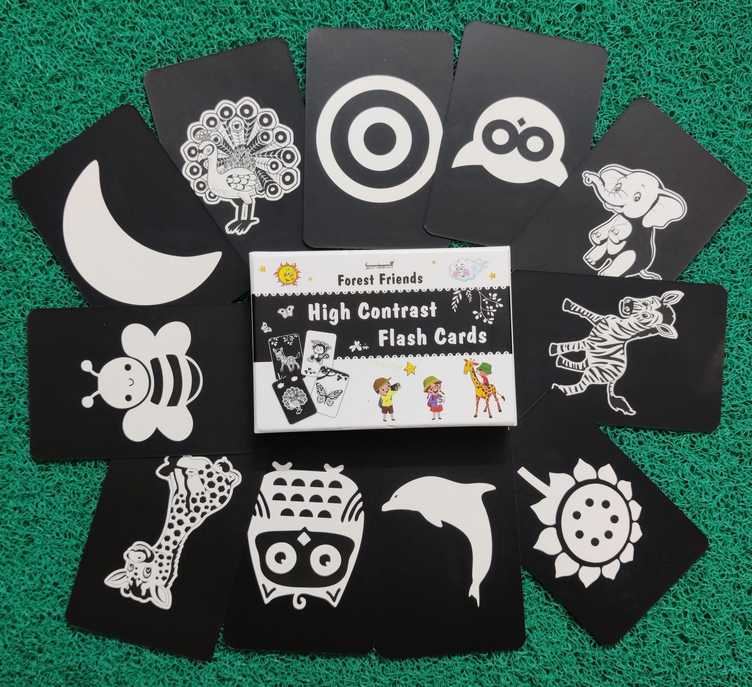 The High Contrast Flash Cards set is specially designed for newborns and young babies, using bold black-and-white images that are easy for developing eyes to see and focus on. These cards help stimulate visual development, attention, and early brain growth during the most crucial early months.