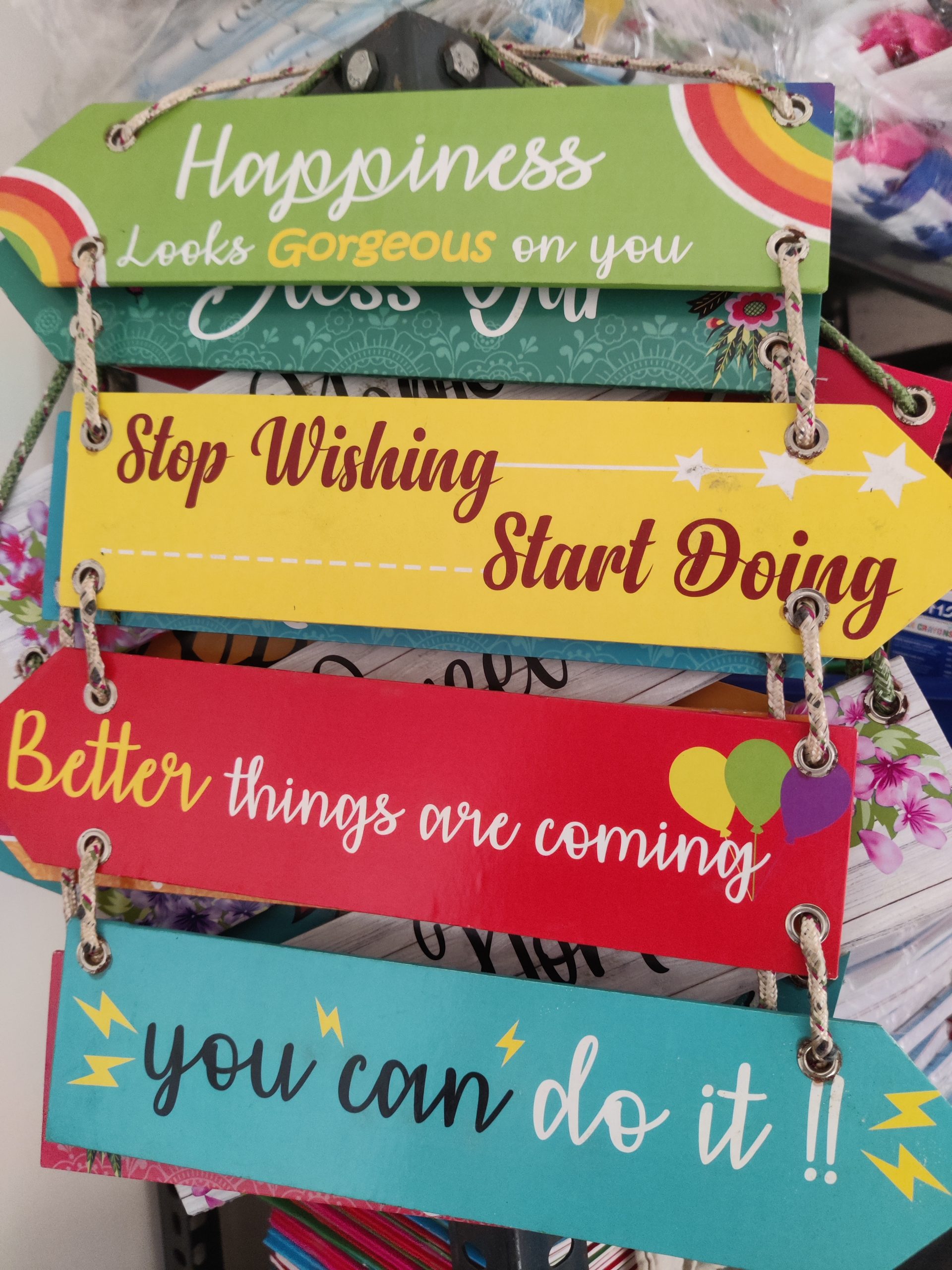 Bring motivation, happiness, and encouragement into your space with this beautifully designed Self Motivating Hanging Wall Décor. Featuring multiple colourful panels with uplifting quotes like “Happiness looks gorgeous on you”, “Stop wishing, start doing”, “Better things are coming” and “You can do it”, this hanging acts as a daily boost of confidence and positivity.